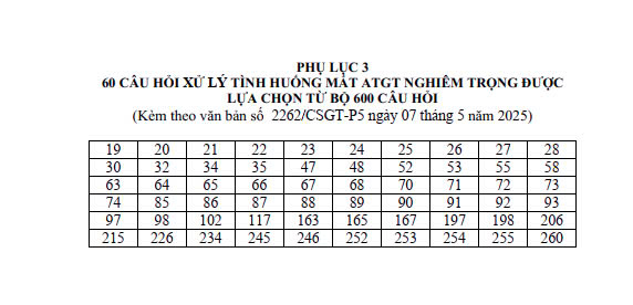 Cục Cảnh sát giao thông (Bộ Công an) đã ban hành Công văn 2262/CSGT-P5 ngày 7/5/2025 hướng dẫn sử dụng bộ 600 câu hỏi dùng để sát hạch lái xe cơ giới đường bộ.